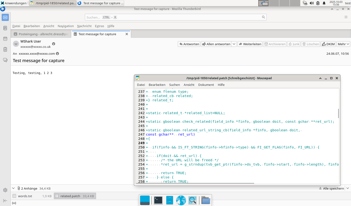 As additional test, I loaded testcase.smtp into Thunderbird on Trixie, opened the 2nd attachment (TB calls an external application for that), and apparently TB does also keep the newline (which breaks the patch file, but that seems to be an issue of the MUA producing the message):