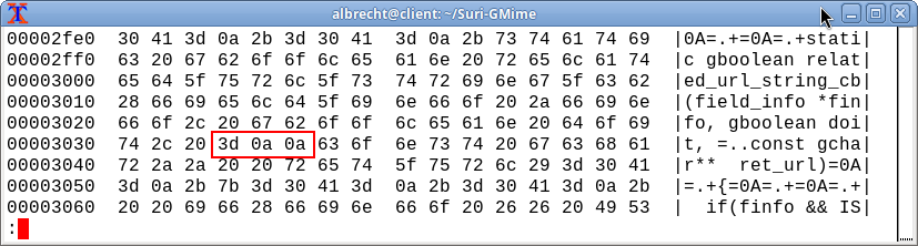 000030d0 73 74 61 74 69 63 20 67 62 6f 6f 6c 65 61 6e 20 |static gboolean | 000030e0 72 65 6c 61 74 65 64 5f 75 72 6c 5f 73 74 72 69 |related_url_stri| 000030f0 6e 67 5f 63 62 28 66 69 65 6c 64 5f 69 6e 66 6f |ng_cb(field_info| 00003100 20 2a 66 69 6e 66 6f 2c 20 67 62 6f 6f 6c 65 61 | *finfo, gboolea| 00003110 6e 20 64 6f 69 74 2c 20 3d 0a 0a 63 6f 6e 73 74 |n doit, =..const| 00003120 20 67 63 68 61 72 2a 2a 20 20 72 65 74 5f 75 72 | gchar** ret_ur| 00003130 6c 29 3d 30 41 3d 0a 2b 7b 3d 30 41 3d 0a 2b 3d |l)=0A=.+{=0A=.+=|