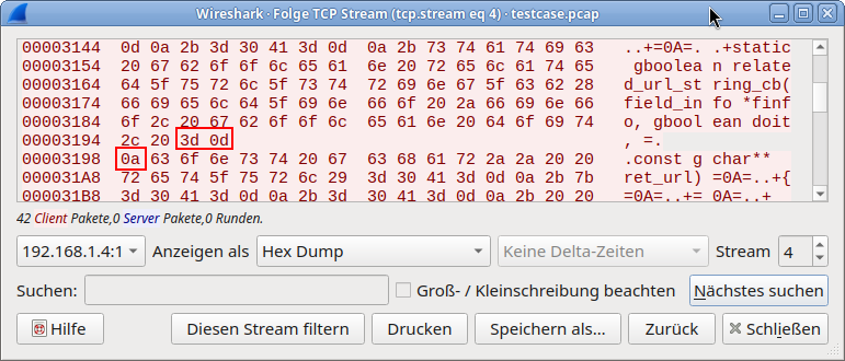 Looking into the Wireshark hex display of the re-assembled TCP stream, I actually see