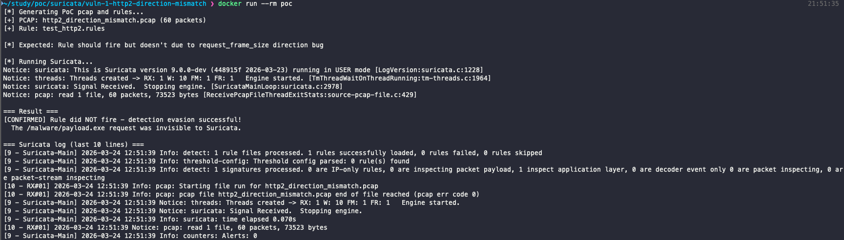 - Current `main` branch (commit bc4a055e7, Suricata 9.0.0-dev) is confirmed affected.