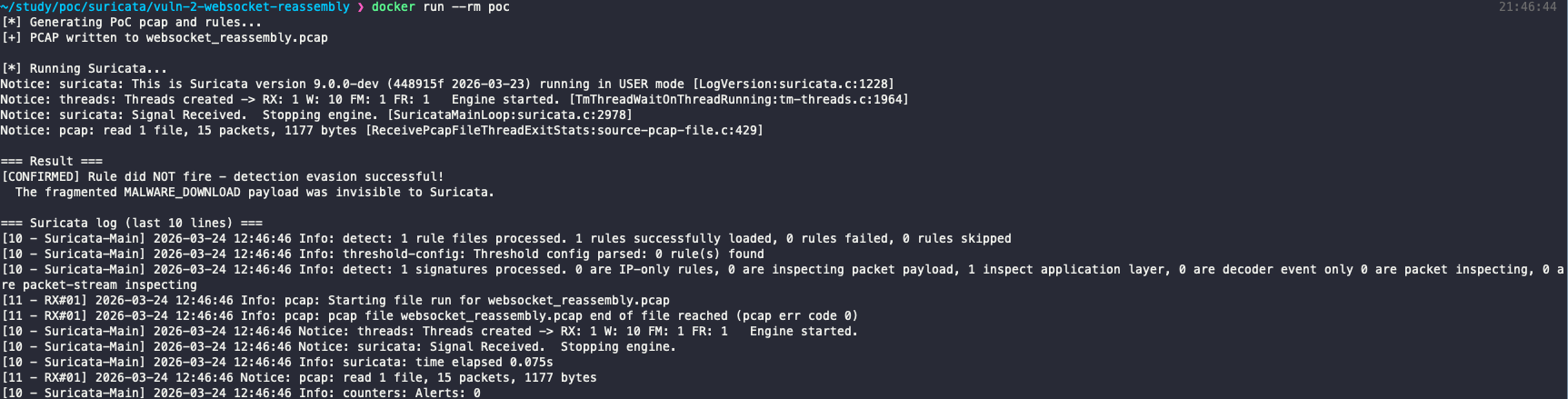 - The interleaved Ping frame is fully RFC-compliant behavior. Legitimate WebSocket implementations may send keepalive Pings between data fragments, meaning this bug also causes false negatives on normal traffic.